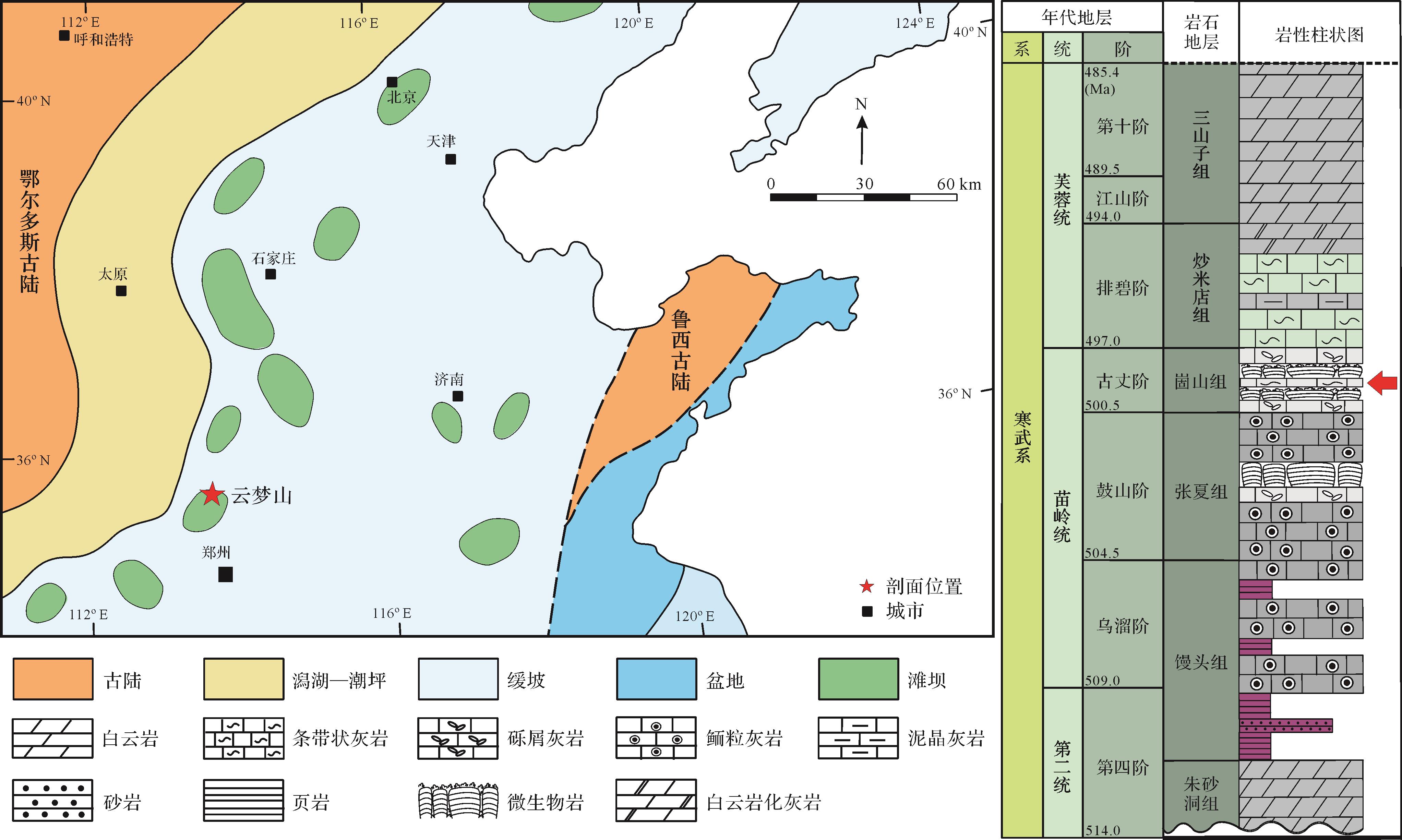 图 1 华北寒武纪苗岭世古地理图及研究区岩石地层单元划分