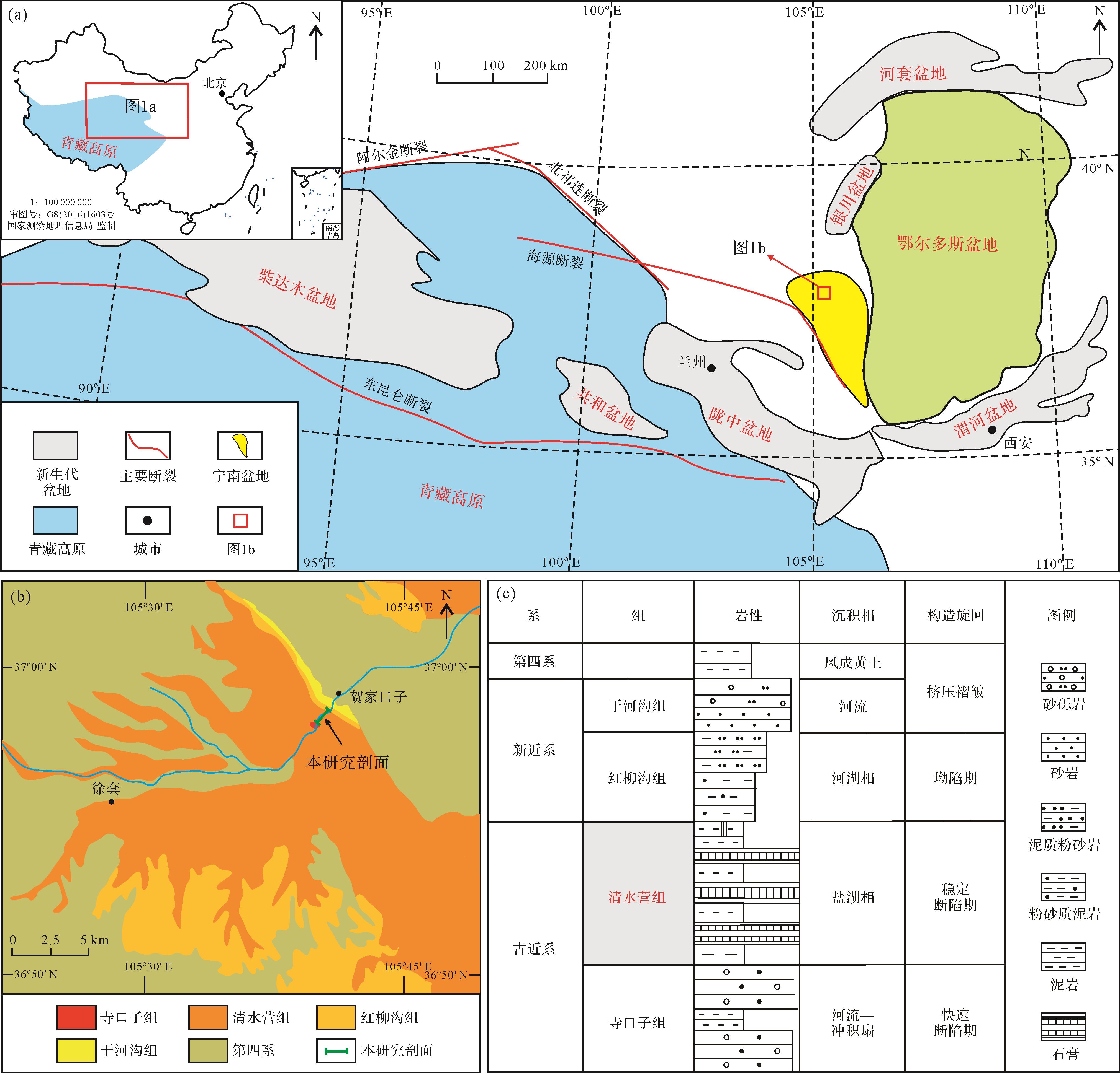 古近纪中期,在区域伸展拉张应力背景下,宁南盆地开始发育始新统寺口子组河流—冲积扇相的砂砾岩,物源区主要在盆地北部和东北;古近纪晚期,区域断陷作用持续,物源稳定,由于气候干燥,盆地发育了清水营组咸化湖盆相的泥岩和石膏;新近纪早期,盆地在经历了一次构造短暂挤压抬升后,继续接受沉积并发育了红柳沟组河流—湖泊相的泥岩和砂岩[27-28,31];新近纪晚期,青藏高原北东向隆升扩展作用增强,盆地发生构造变形,开始逐渐萎缩,宁南盆地沉积了以砂砾岩为主的干河沟组;第四纪主要发育风成黄土(图1b)。宁南盆地北部断陷规模最大,后期受到青藏高原的影响也相对较小,因此宁南盆地北部清水营组地层发育最连续,厚度最大。本研究野外剖面——贺家口子剖面,就位于宁南盆地北部(图1c)。
