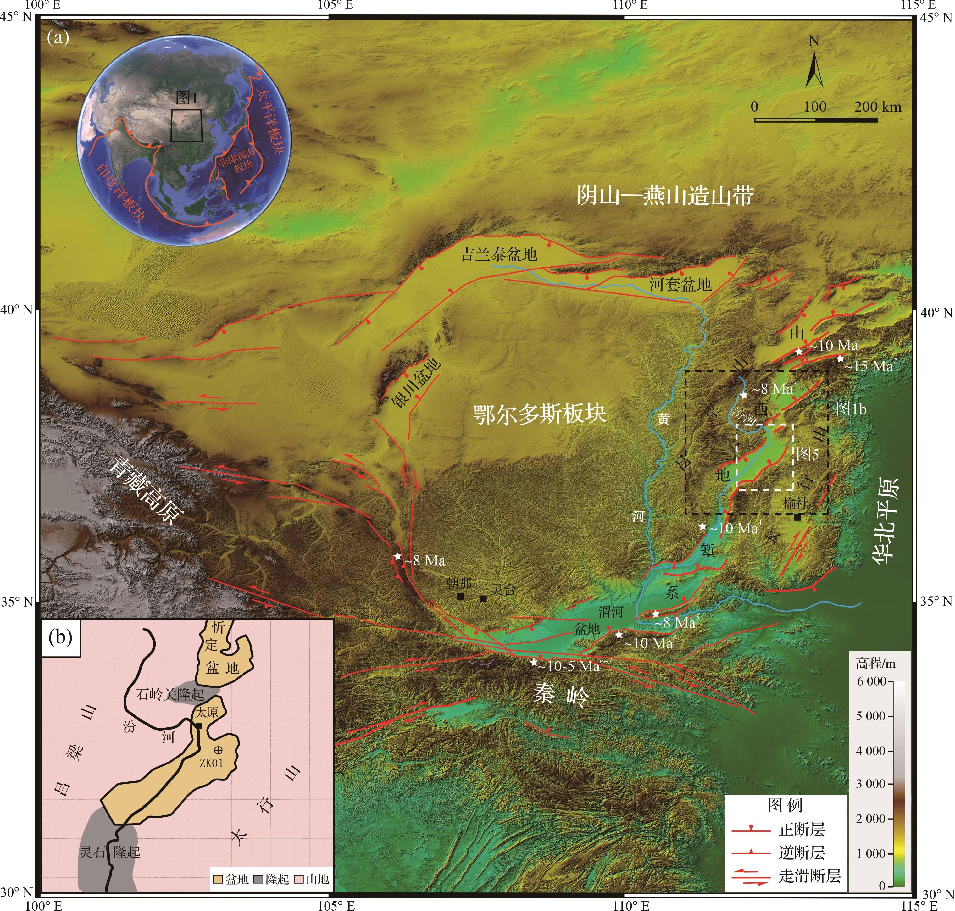 图 1 (a)鄂尔多斯块体及周缘地区区域构造背景和数字高程模型(SRTM 90 m分辨率);(b)太原盆地及周边地质地貌略图