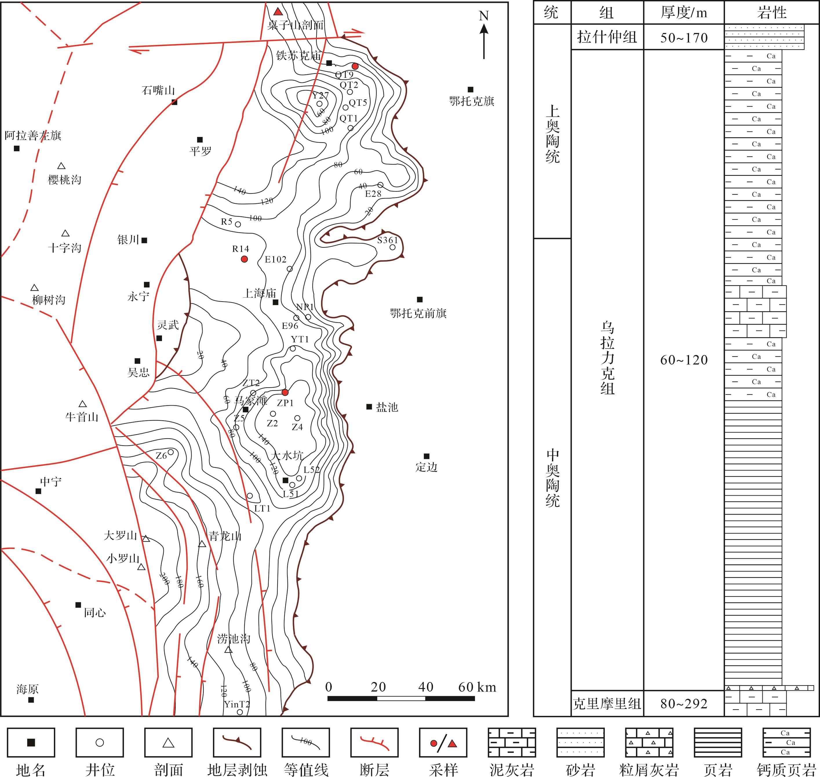 早奥陶世早期,贺兰裂谷不断裂陷,盆地西缘北部为一套末端变陡的缓坡型碳酸盐岩沉积;至中奥陶世,贺兰坳拉谷沉降更加显著,构造活动北弱南强,盆地西缘北部沉积相对较薄;中奥陶世晚期至晚奥陶世,区内处于扩张向收敛的构造转化时期,表现为海侵到海退的演变过程,发育了一套边缘海槽相沉积[26⁃30]。区内奥陶系自下而上为台地相向斜坡—盆地相过渡:三道坎组为厚层块状石英砂岩和云质灰岩互层;桌子山组和克里摩里组均为含生物化石的虫孔灰岩,并夹有黑色页岩;本次研究的重点乌拉力克组主要为硅质页岩向混合页岩的过渡;拉什仲组为浊流成因的砂泥岩互层(图1);公乌素组主要为薄层页岩、泥灰岩互层[24,31⁃32]。