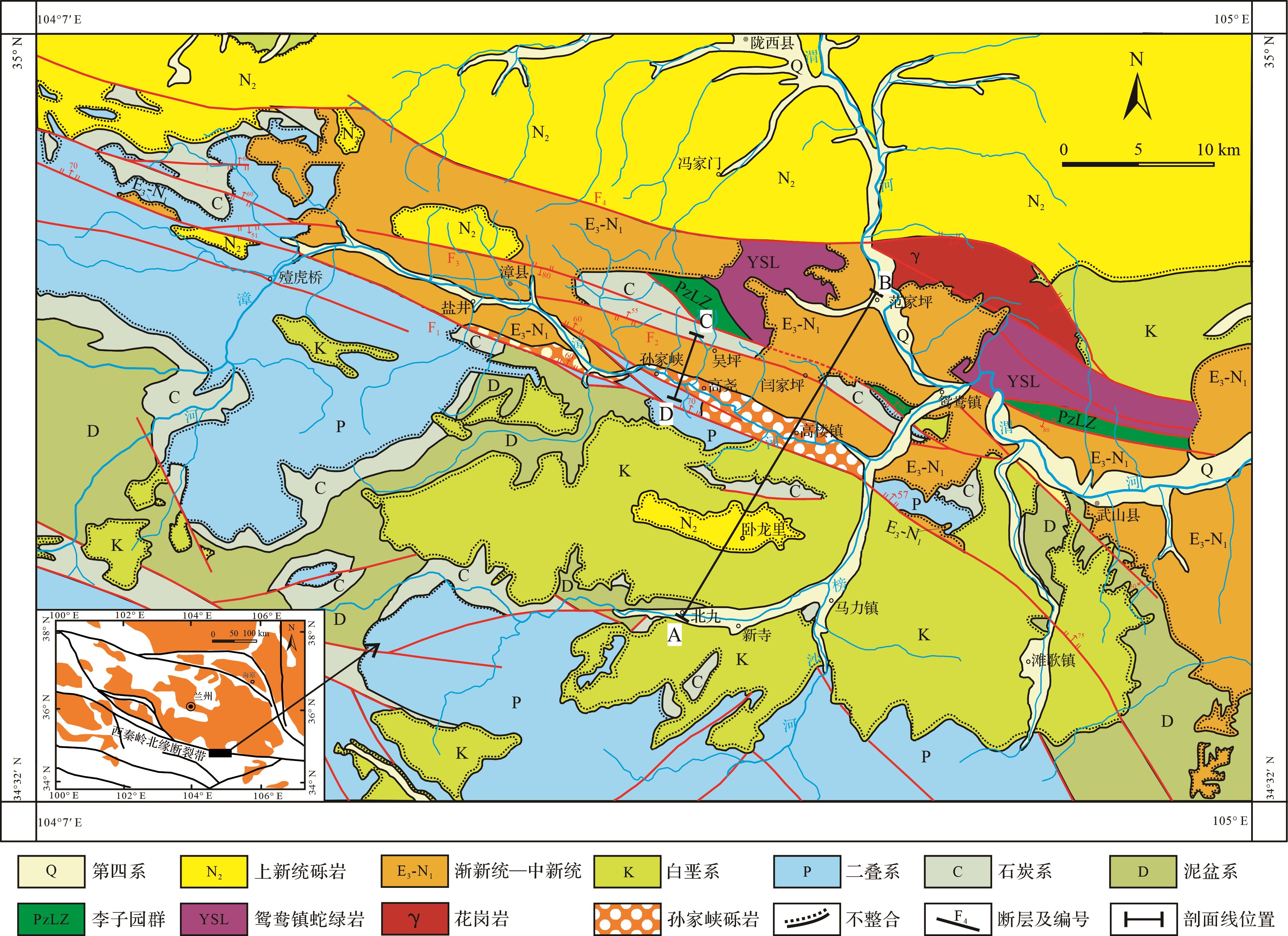 青藏高原东北缘一系列新生代盆地的沉积地层被认为是青藏高原东北缘隆升的地质记录,国内外地质学家曾对这些沉积地层的沉积岩石序列及沉积环境演变、古地磁年代和磷灰石热年代学、同位素物源示踪和碎屑锆石的物源示踪、孢粉组合和动物大化石等做了大量研究,提出了各种青藏高原扩展生长和东北缘隆升模型[1⁃20],其中3.6 Ma和8 Ma以来东北缘快速隆升,并且已隆升到一定高度的观点[2,5,13,21]在地学界影响深远,但争议依然存在[22-26]。西秦岭北缘构造带作为青藏高原东北缘重要的组成部分,其漳县—武山段新生代沉积记录保存较完整,既保存有厚度近4 000 m的渐新统—中新统由红到灰的多个旋回的沉积地层[25-26]又出露一套产状近水平、角度不整合在渐新统—中新统之上的、厚度近400 m的上新统洪积扇粗砾岩层,这套砾岩层、与贵德—循化盆地的甘家砾岩、临夏盆地的积石山砾岩等具有相似的地质背景和岩石组合及成因,是约束青藏高原东北缘隆升的重要的地质记录[27-28]。加上该地区发育的断裂构造系统和丰富多期的构造现象,使得其成为研究青藏高原东北缘新生代地质过程、印度—欧亚碰撞汇聚的远程动力学响应及高原扩展生长等科学问题难得的天然实验室。西秦岭北缘构造带及其北侧的临夏盆地—循化盆地—贵德盆地底部普遍发育一套被称为它拉组的砾岩、砂砾岩、砂岩沉积地层,并被认为是一套冲积扇或山区河流相沉积,年龄29.0~21.4 Ma(临夏盆地)[1,13,16]或23.1~21.1 Ma(贵德—循化盆地)[2,17,20],厚度约100 m,它代表青藏高原东北缘新生代沉积盆地发育的初始记录,但这套砾岩是伸展构造背景下的断陷盆地沉积,还是挤压背景下的挠曲前陆盆地沉积,还存有争议。这一问题涉及青藏高原东北缘新生代盆地的构造属性和印度—欧亚碰撞汇聚的以挤压缩短为主的动力学在东北缘的响应等重要科学问题,值得进一步研究。西秦岭北缘构造带漳县—武山地区孙家峡漳河两岸出露的渐新统,主要由河流加积的砾岩、砂砾岩、砂岩、砂质泥岩和整合其上的湖相灰色和红色泥岩沉积组成,构成一个完整的下粗上细的沉积旋回,与它拉组沉积岩石组合和旋回特征相近,但层序和旋回更为完整,厚度达600 m,仅下部砾岩、砂砾岩为主的砾岩层厚度就达300 m。鉴于渐新统底部砾岩层在孙家峡漳河两岸出露齐全,层序完整,厚度巨大,具有代表性,因此,我们将其命名为孙家峡砾岩[29]。本文试图通过对孙家峡砾岩沉积旋回、沉积构造、砾石成分、古流向等沉积特征研究,查明其沉积环境,并结合对控制这套砾岩沉积的边界断层多期变形的关系分析,探讨这套地层发育的构造背景,试图澄清西秦岭北缘渐新世沉积盆地到底是伸展断陷盆地还是挤压挠曲前陆盆地的分歧,为印度—欧亚碰撞汇聚的以挤压缩短为主的动力学在东北缘的响应及东北缘隆升等提供新的地质依据和约束条件。